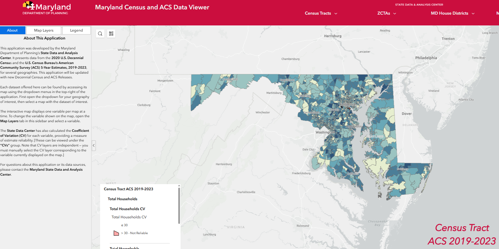 The Census and American Community Survey Data Viewer allows the user to view data for several data products across several geographies for the state of Maryland. The application shows both Census and ACS 5-Year datasets for: Census Tracts, ZCTAs, MD House Districts, MD Senate Districts and Maryland Counties.
